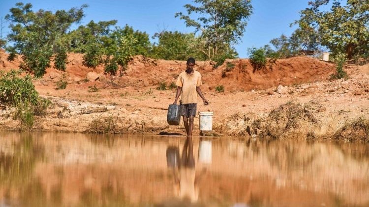Một tiểu nông dân ở miền Nam châu Phi, khu vực đang bị hạn hán, lấy nước từ ao để tưới cho cây trồng của mình